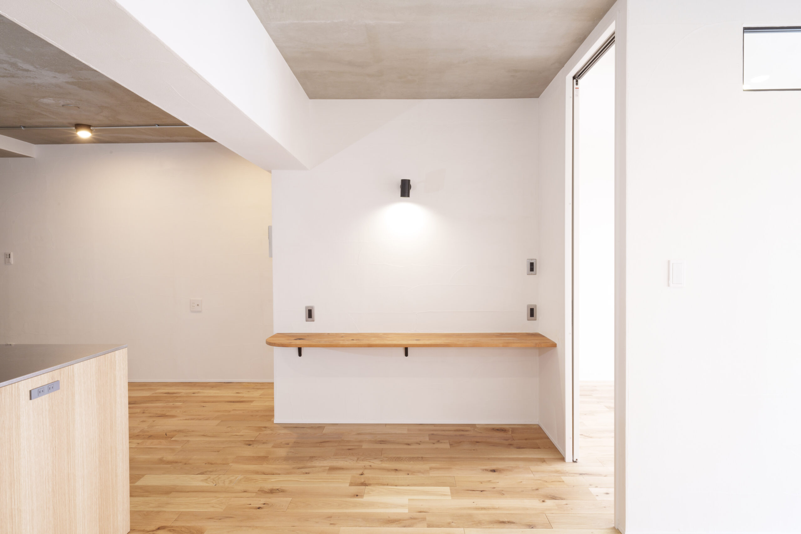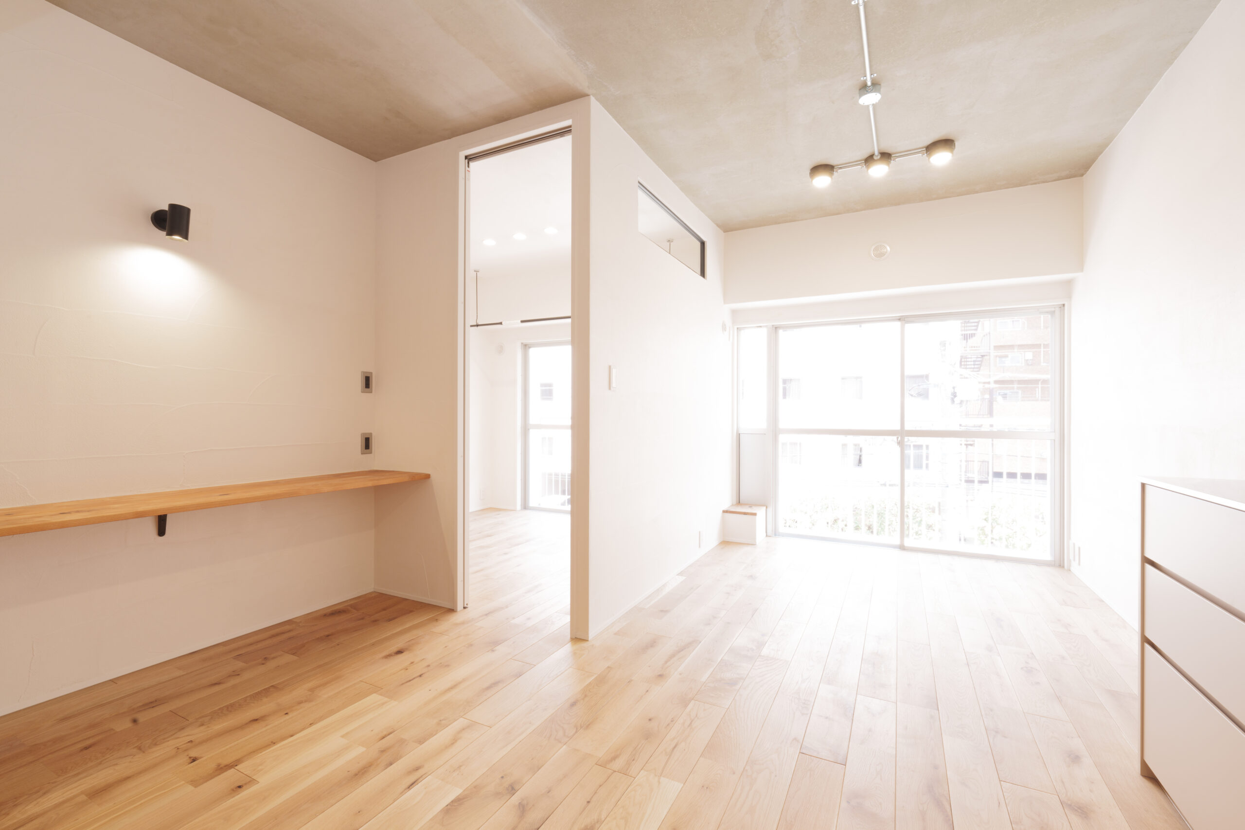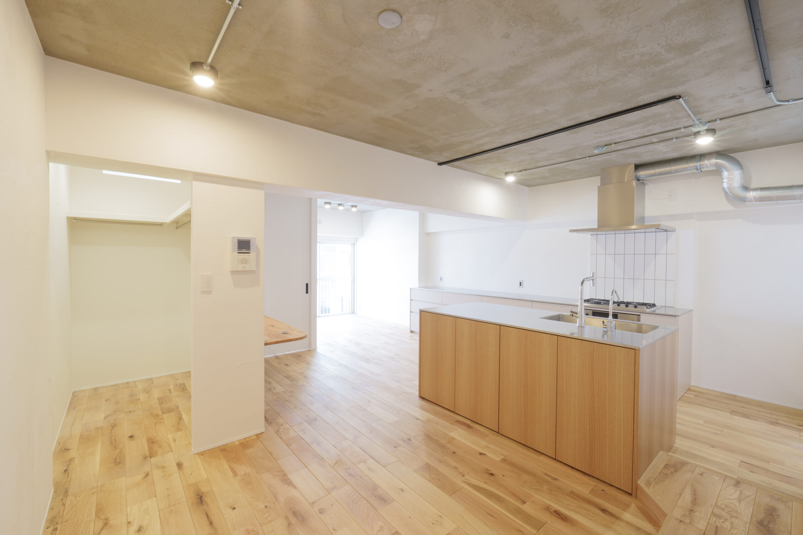 将来の暮らしの変化に合わせて間取りを調整できる、可変性のあるマンションフルリノベーション。今は1LDKとして広々と使いながら、ライフステージに応じて2LDKへ変更できるプランを計画しました。アイランドキッチンを中心に回遊動線を整え、収納計画も充実。開放感と暮らしやすさを両立したマンションリノベです。