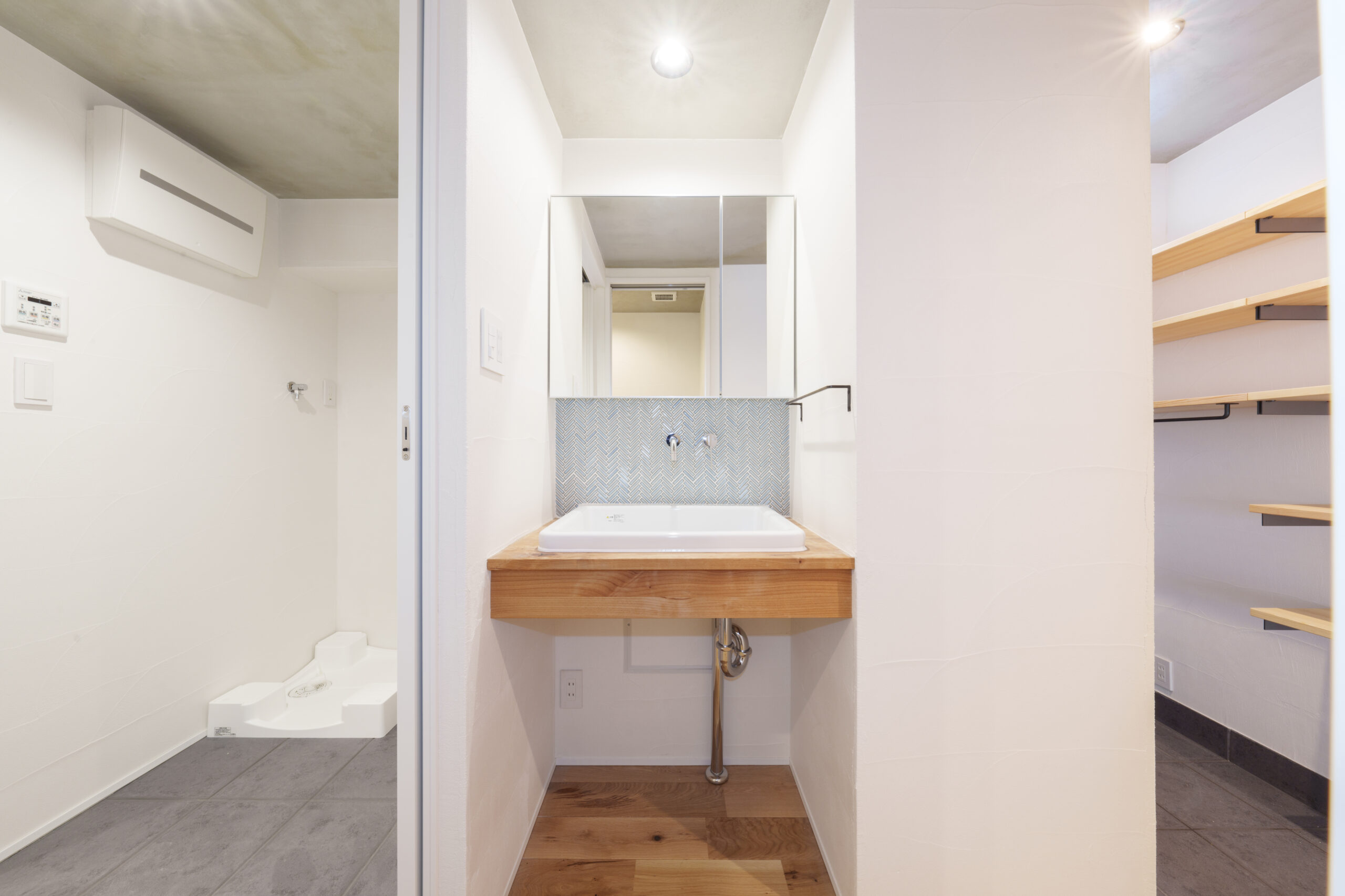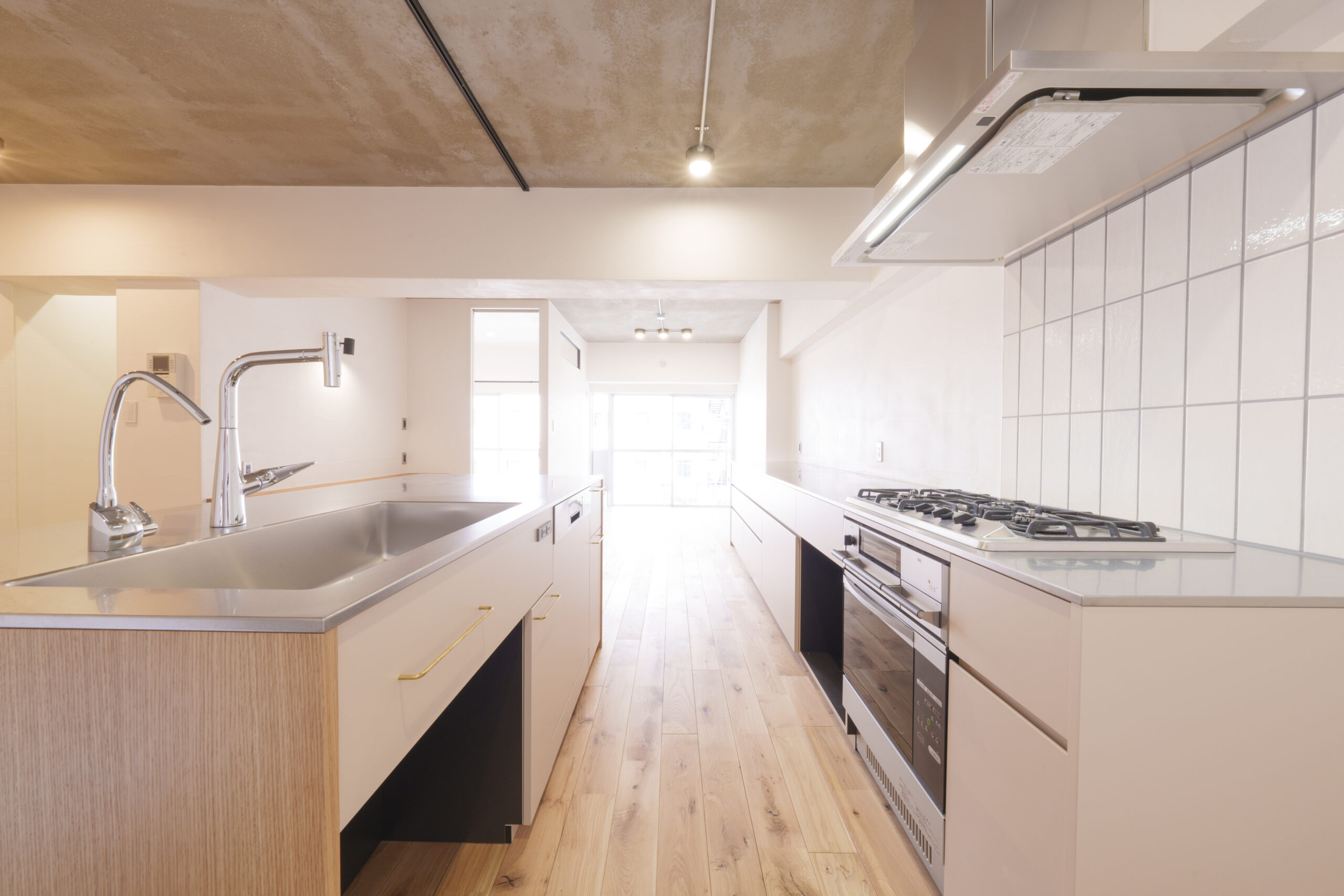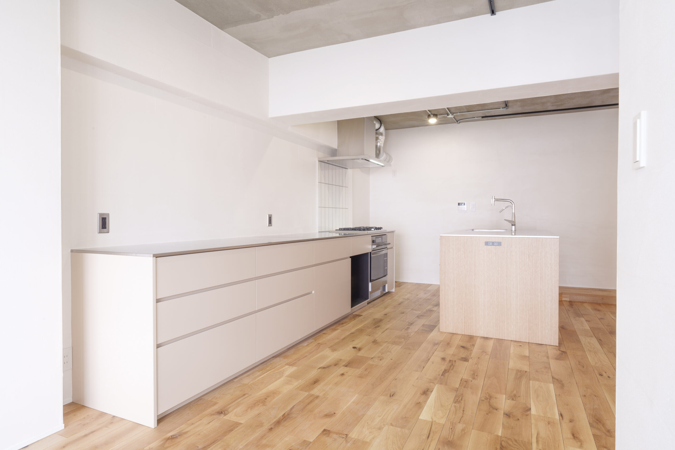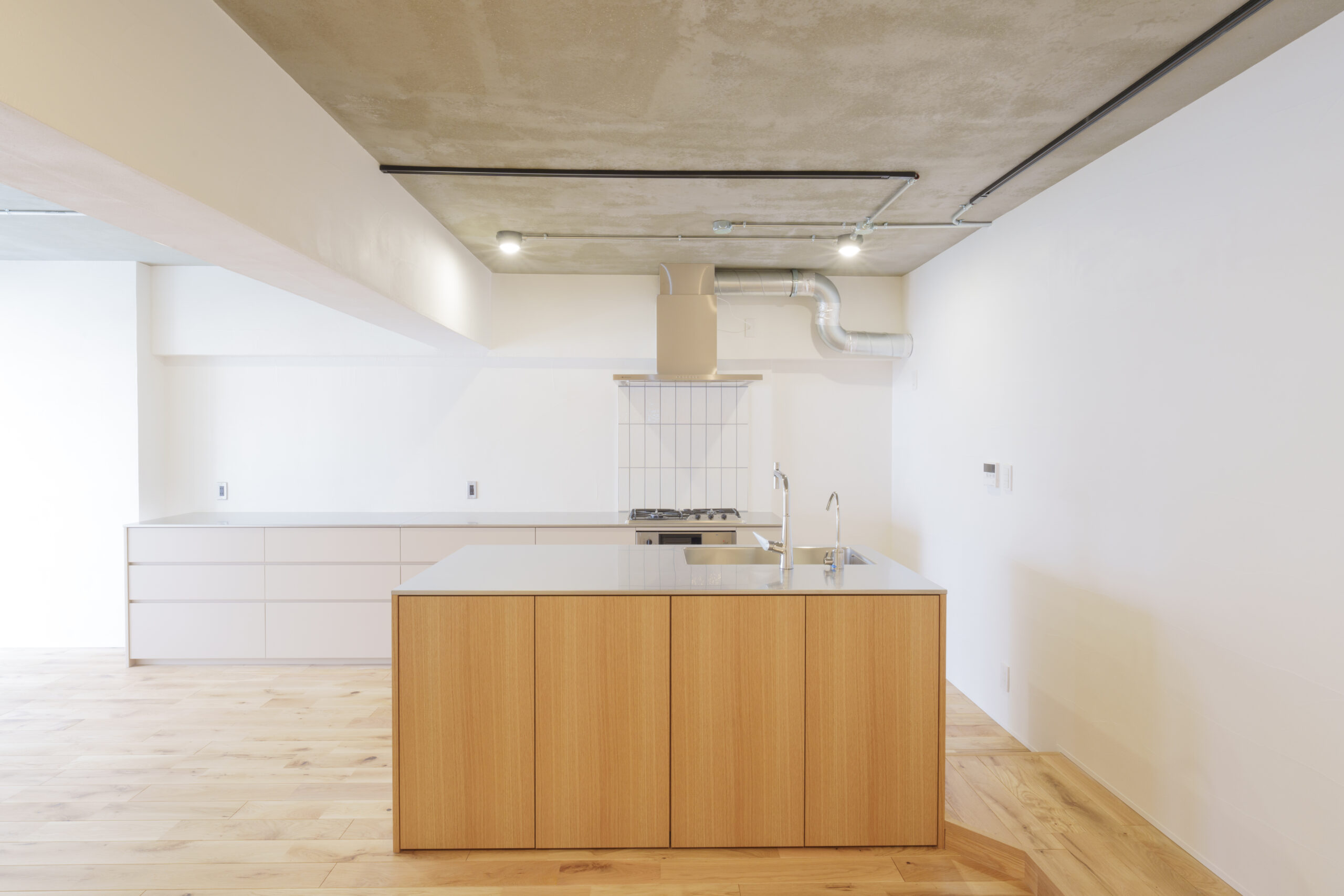 将来の暮らしの変化に合わせて間取りを調整できる、可変性のあるマンションフルリノベーション。今は1LDKとして広々と使いながら、ライフステージに応じて2LDKへ変更できるプランを計画しました。アイランドキッチンを中心に回遊動線を整え、収納計画も充実。開放感と暮らしやすさを両立したマンションリノベです。