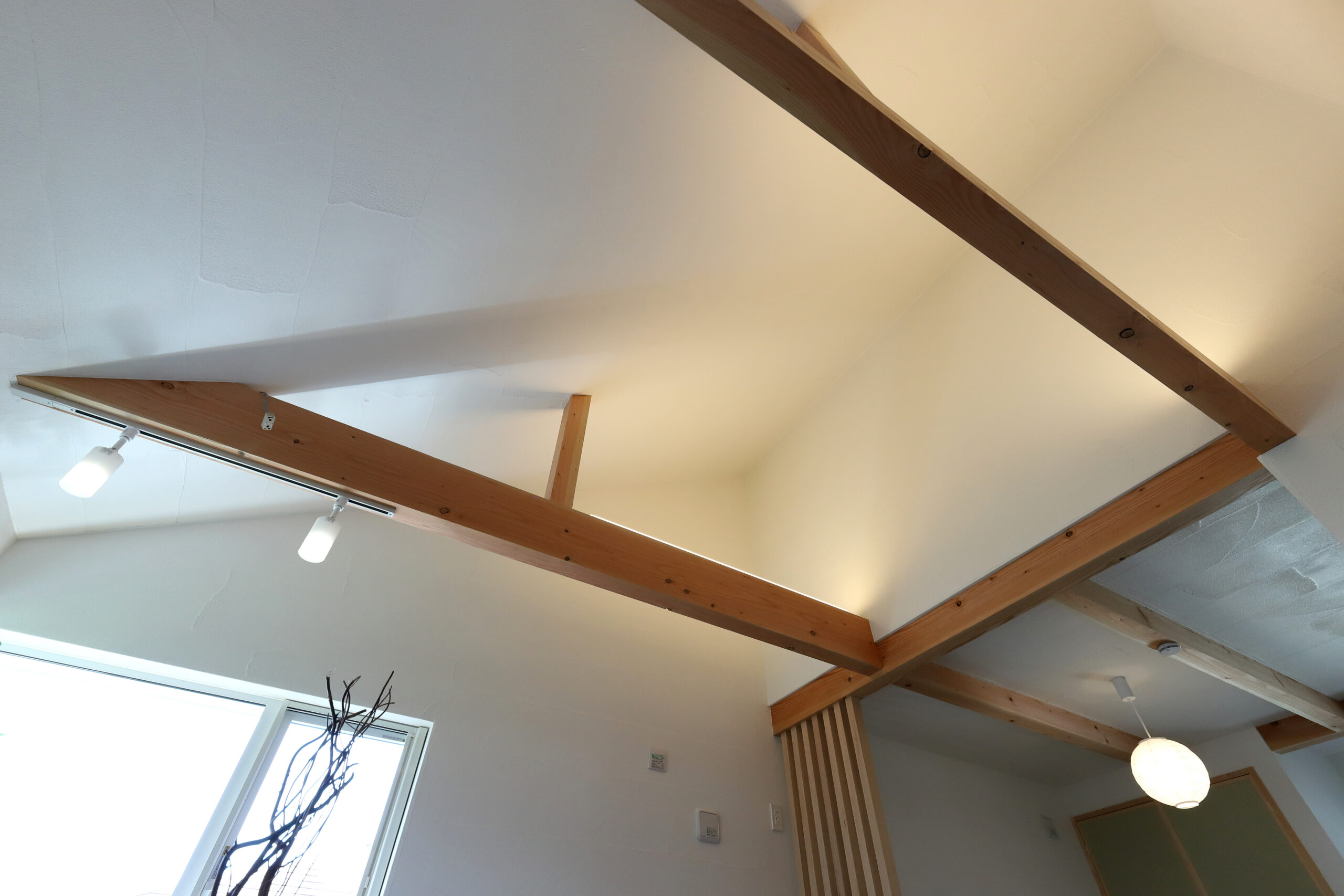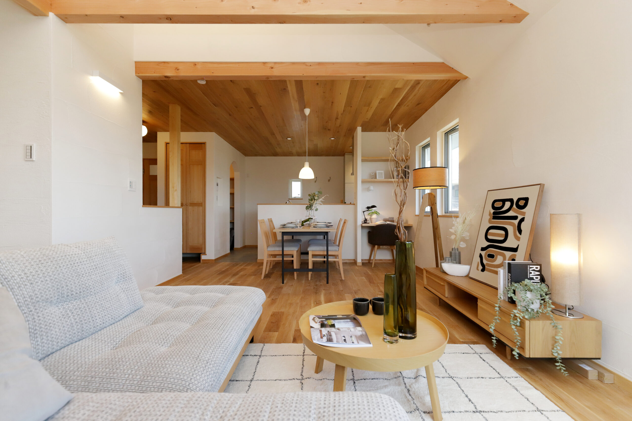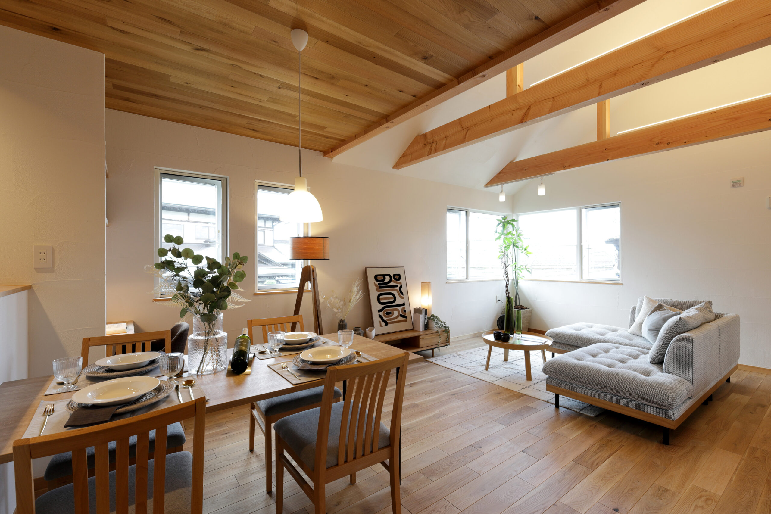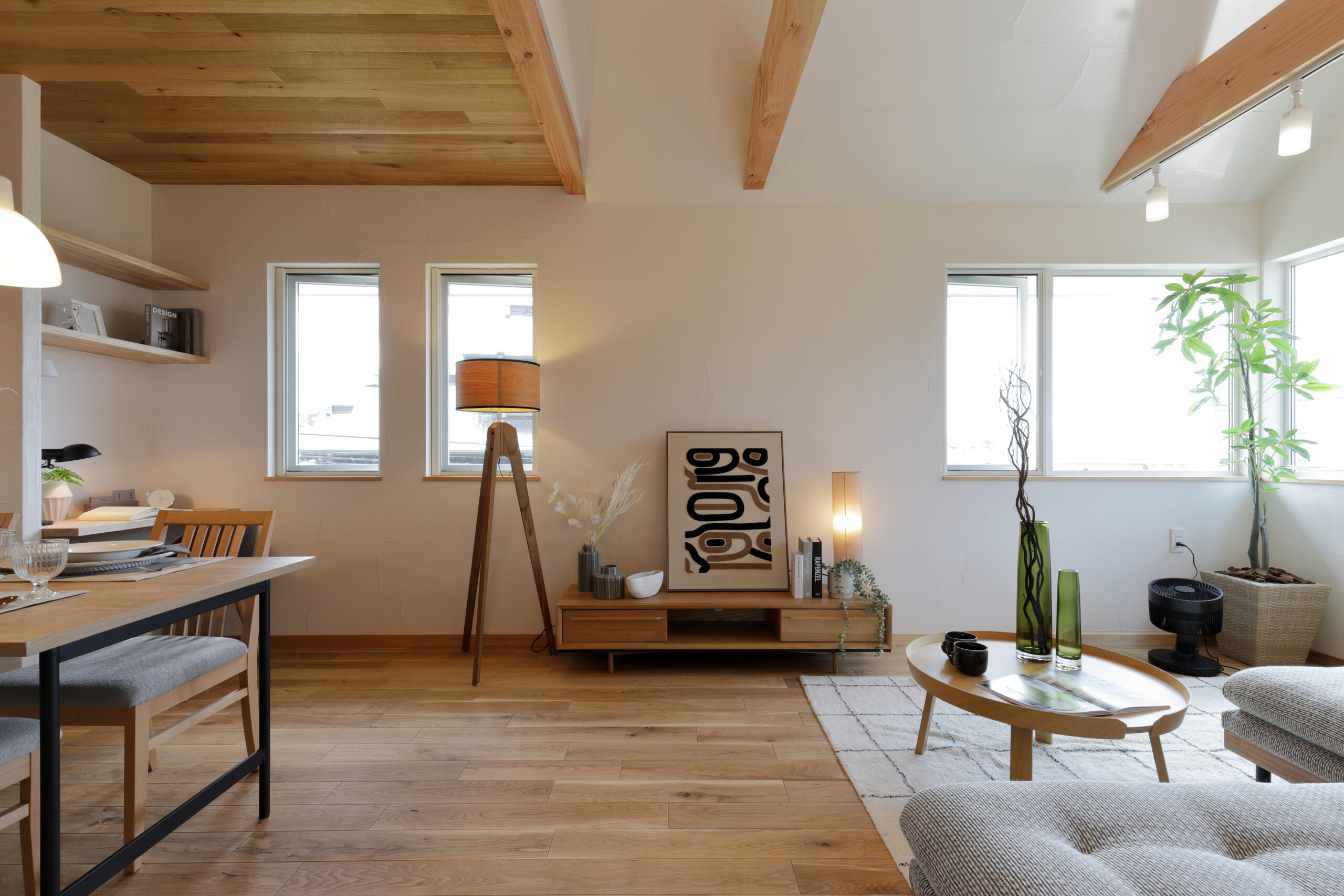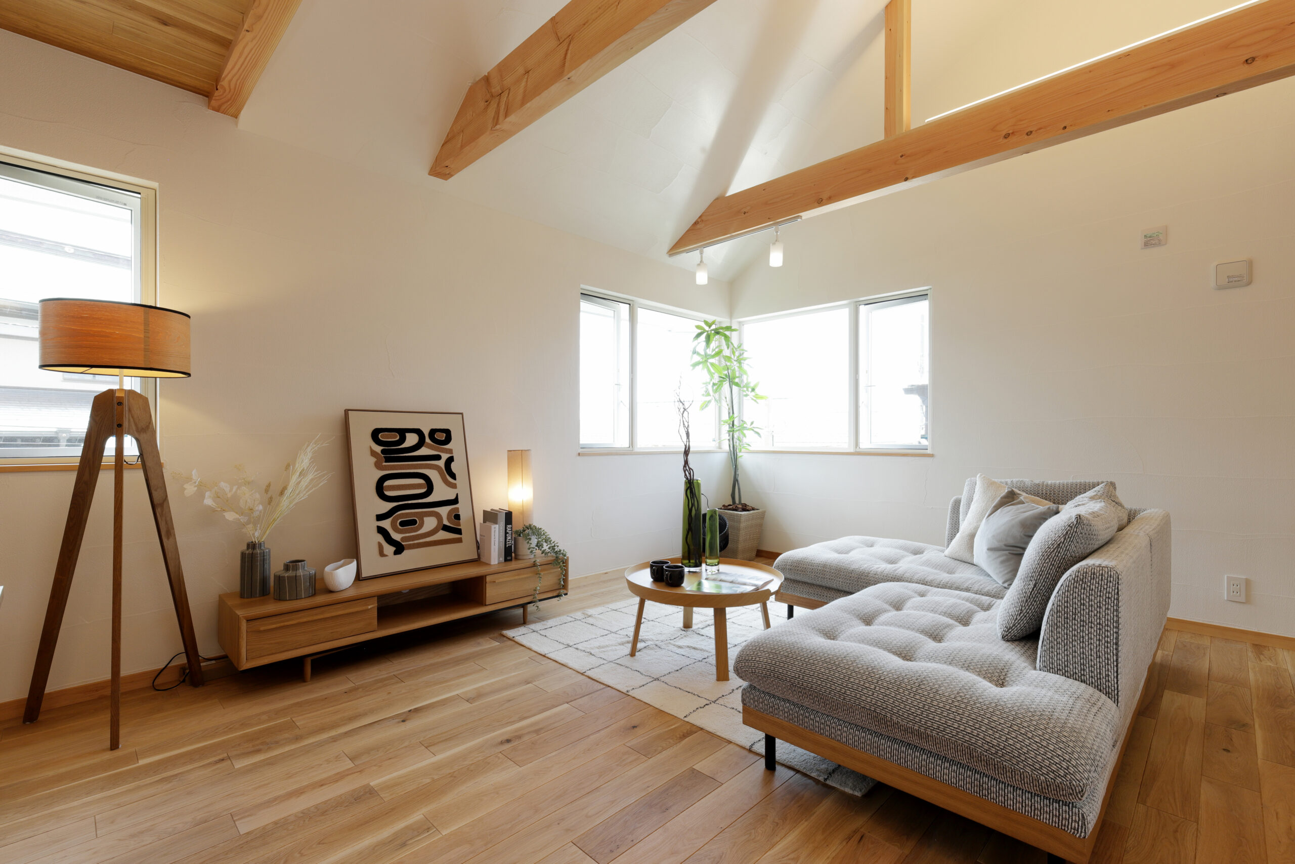 勾配天井と大きな窓がつくる開放感に包まれた2階リビングは、家族が自然と集まる心地よい空間。